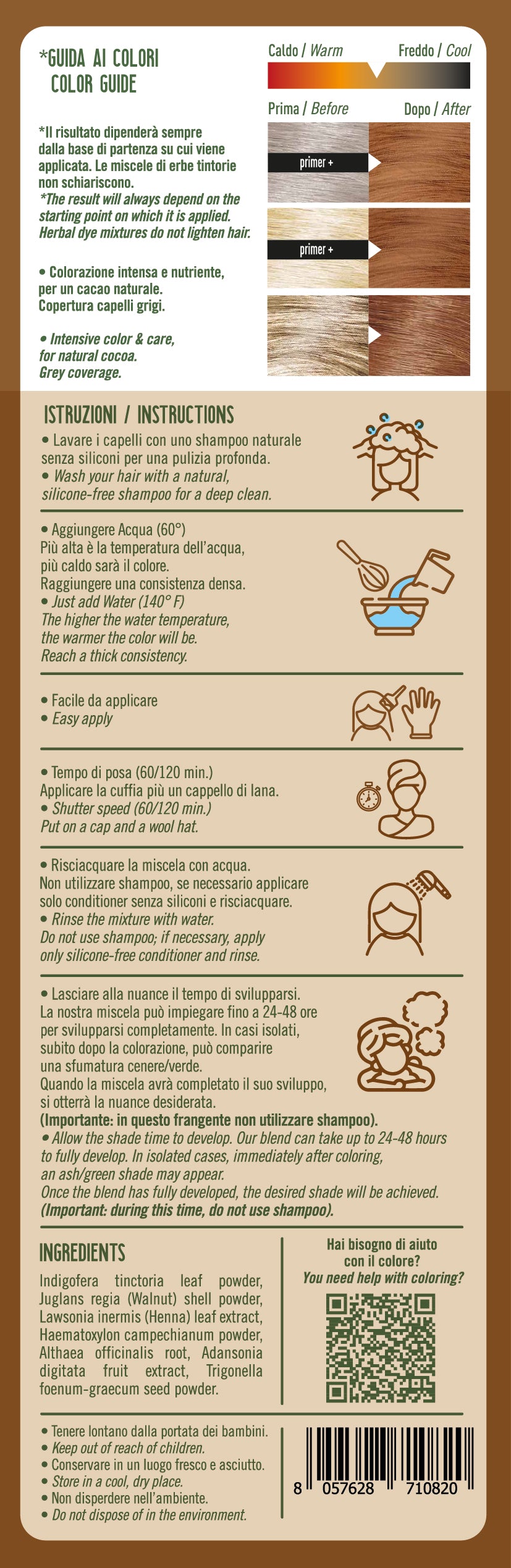 Composto da una preziosa miscela in polvere 100% vegetale. I pigmenti di erbe naturali aderiscono alla superficie capillare e creano sfumature uniche nutrendo e proteggendo i capelli ed il cuoio capelluto. Tra gli ingredienti annoveriamo il methi che favorisce il naturale ciclo di crescita, il baobab dalle note proprietà ristrutturanti e l' altea dalle note proprietà idratanti, emollienti e lenitive, rendendo i capelli più morbidi, lucidi e voluminosi.