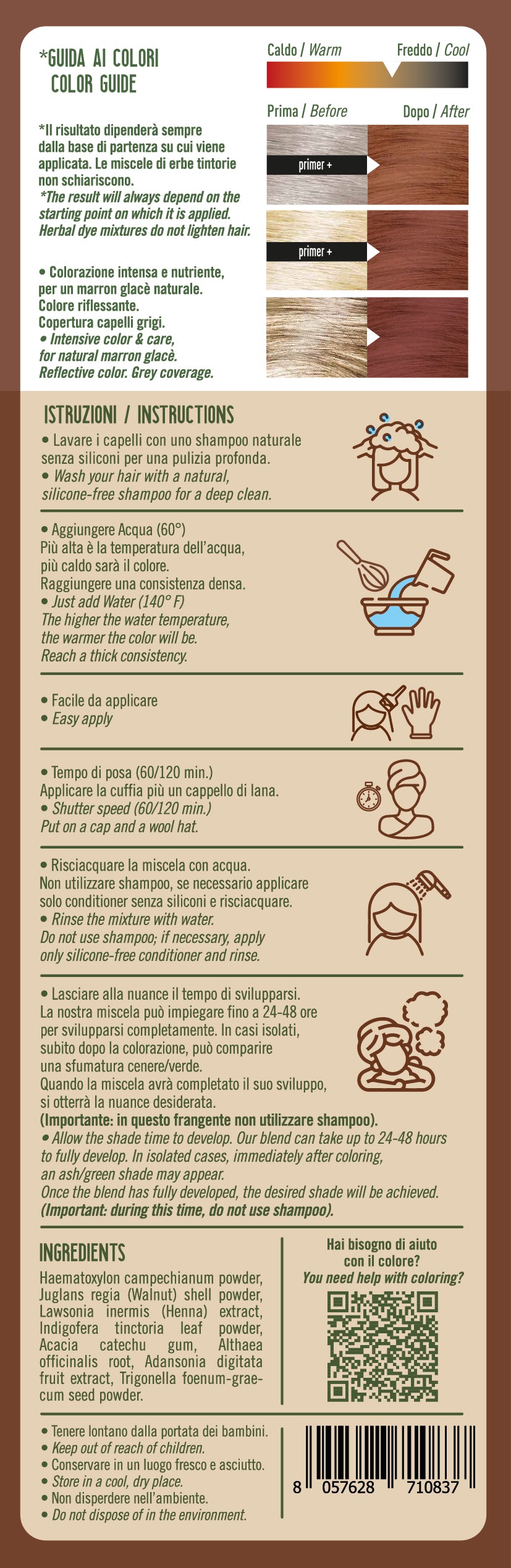 Ingredienti: Estratto di Lawsonia inermis (Hennè), Polvere di foglie di Buxus Dioica, Polvere di Haematoxylon campechianum, Polvere di guscio di Juglans regia (Noce), Estratto di frutto di Adansonia digitata, Radice di Althaea officinalis, Polvere di semi di Trigonella foenum-graecum