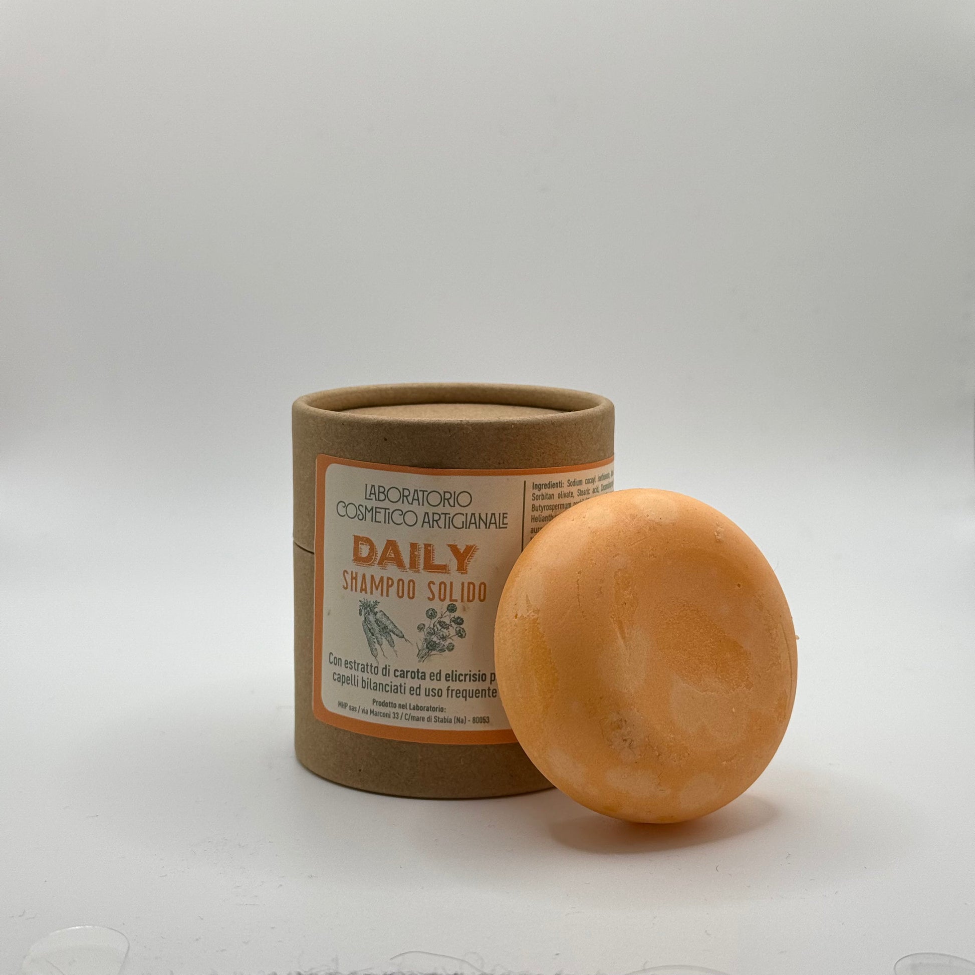 Shampoo solido preparato con estratto di carota ed elicrisio per capelli bilanciati ed uso frequente, senza profumi di sintesi con oli essenziali puri di menta piperita, limone e arancia dolce.